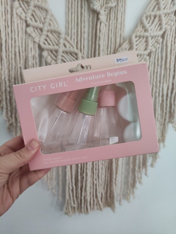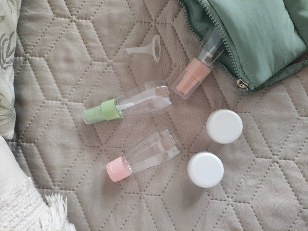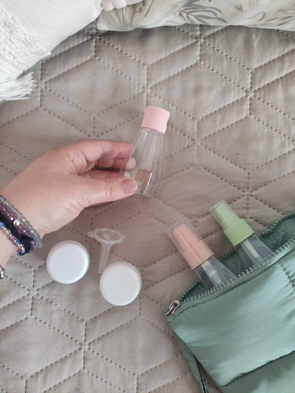 Incluye botellitas con tapa a rosca, dispensadores para líquidos y frascos para cremas.