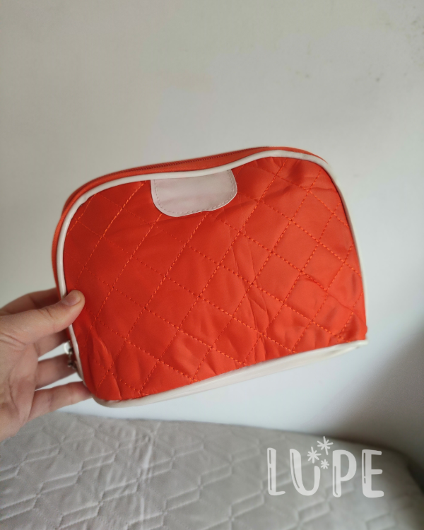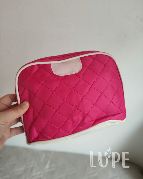 Organizá tus cosméticos y artículos de higiene en este neceser con diseño elegante en color y detalles en blanco.